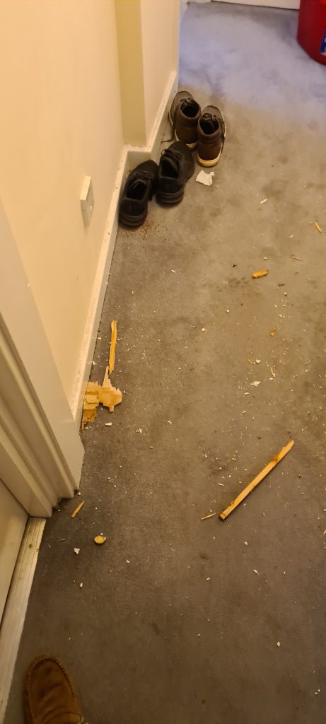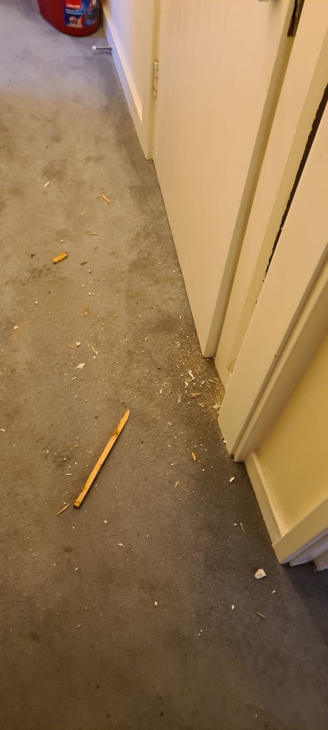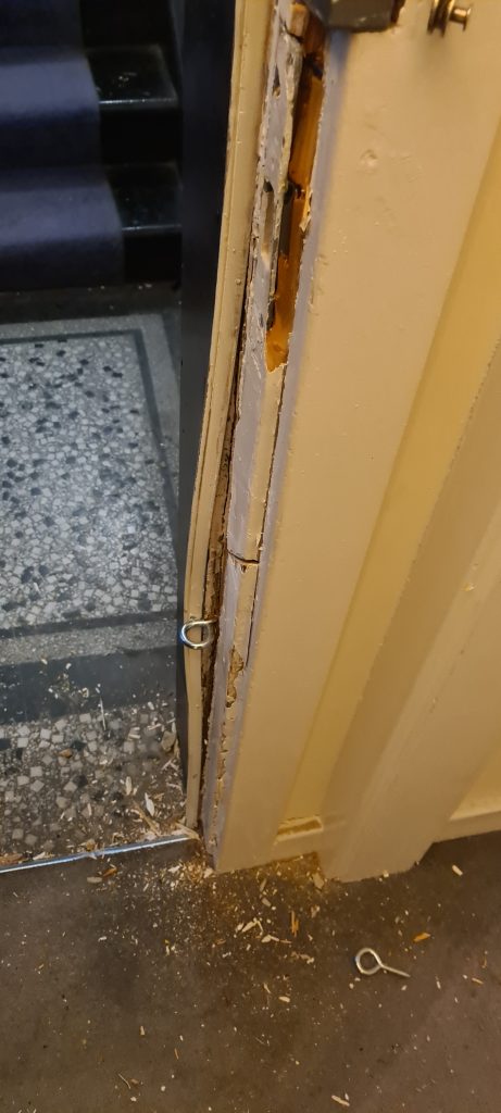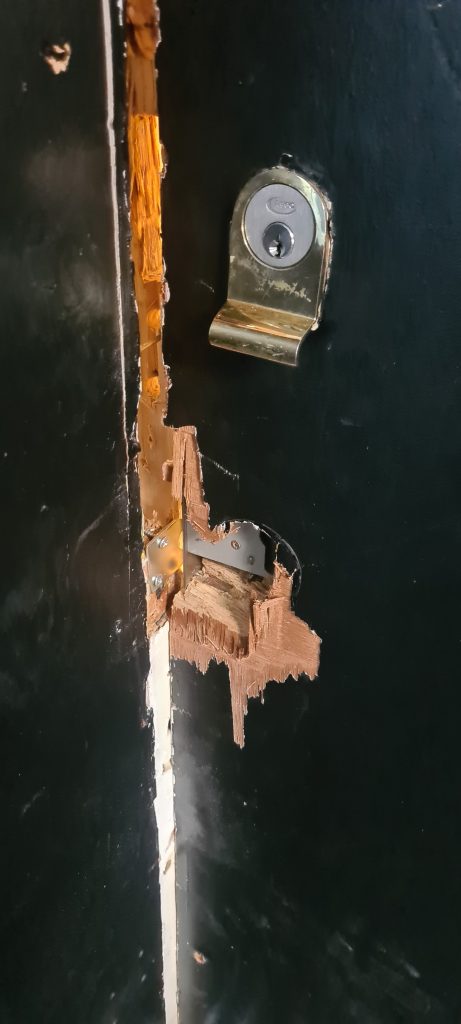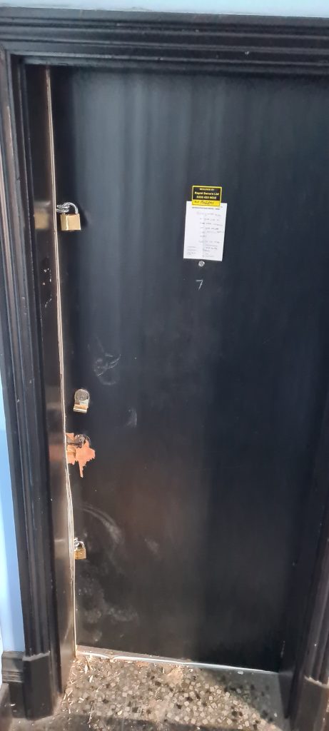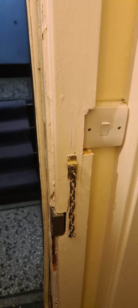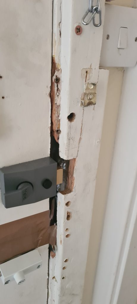 In January 2022 I had to pay for the services of a locksmith to gain entry and repair the frame and door as best they could. They were at the property most of the day putting the door frame back on as best they could. I’m living in benefits and the £300+ it cost me to gain entry is unaffordable to me.