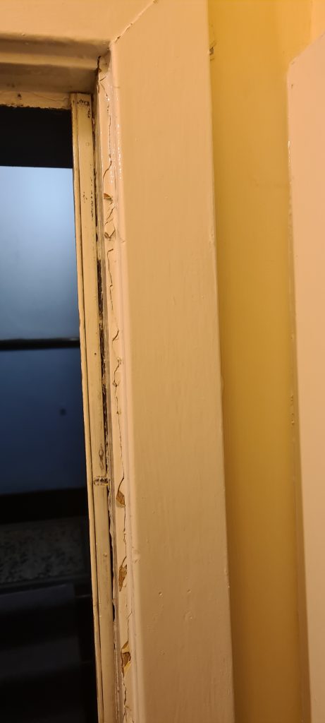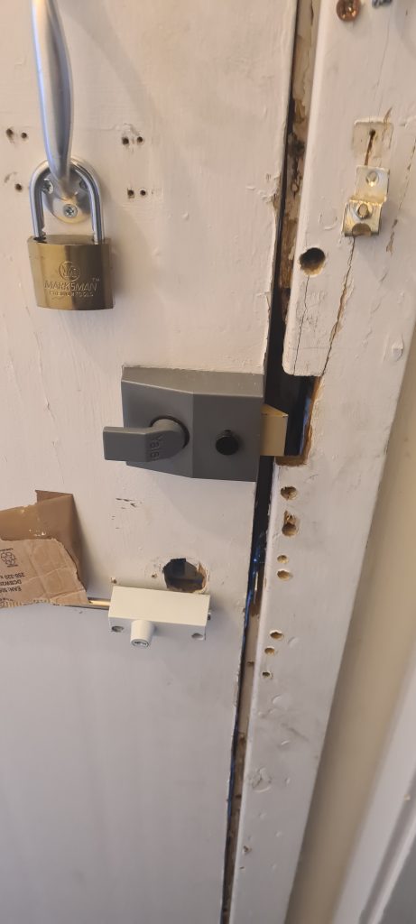 I purchased deadbolt locks and fitted one myself as the landlord, the local council, whilst sending a repair man to look at the damage quickly, failed to carry out any work and the door is still in this state 7 months later. I attempted to fit a second deadbolt lock to the door, but it is in such a bad state of repair that it won’t fit securely.